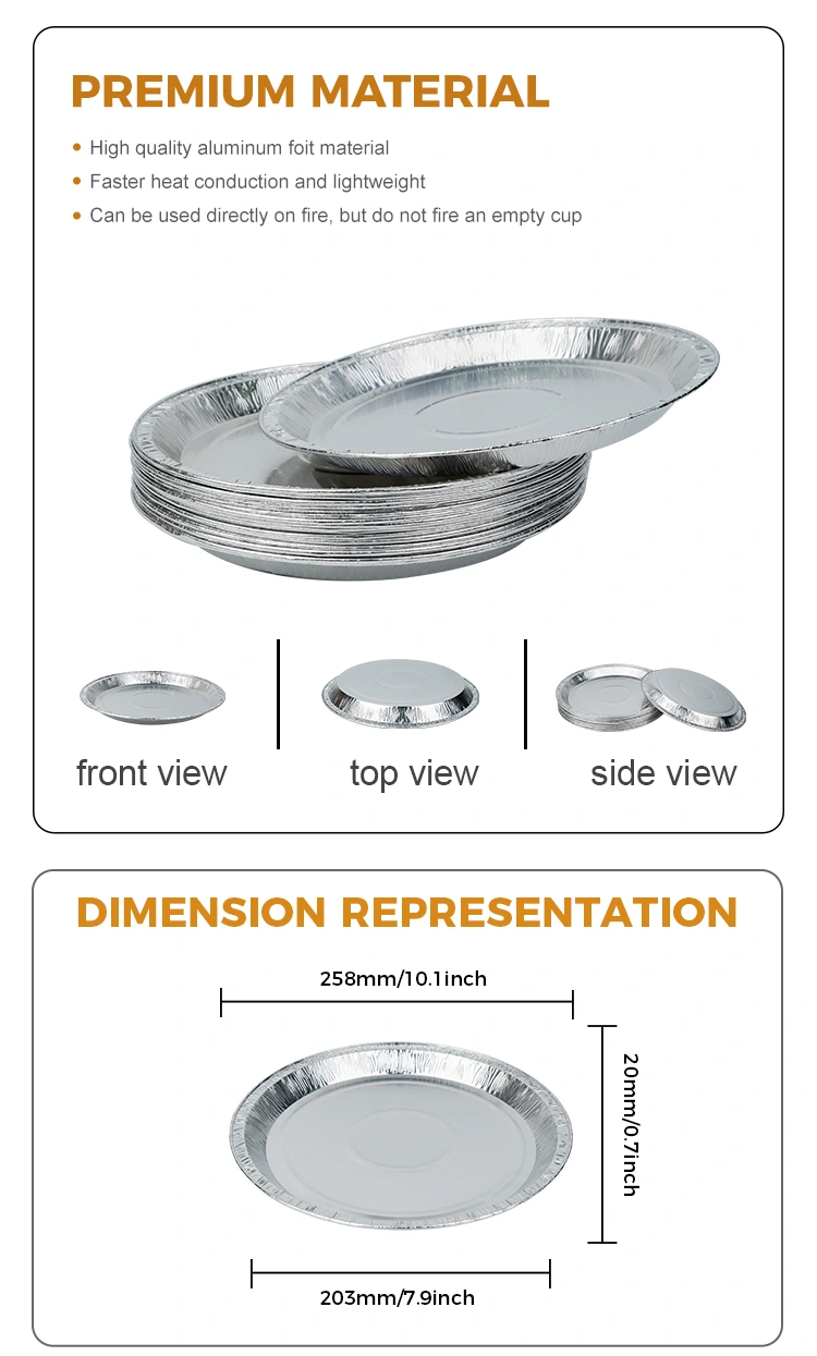 Yunchu Aluminiumfolie bietet eine 10 -Zoll -Pizza -Pizza -Silber -Aluminiumfolie mit Modellnummer 13110. Das Produkt hat einen oberen Durchmesser von 258 mm (ca. 10,1 Zoll), einen unteren Durchmesser von 203 mm (ca. 7,9 Zoll) und eine Höhe von 20 mm (ca. 0,7 in Zentimeter). Mit einer Kapazität von ca. 695 ml (ca. 24,5 Unzen) eignet es sich zum Backen von Pizza ohne Kleben, leicht aus der Form und hat keinen Geruch. Darüber hinaus verhindert sein erhöhtes Kantendesign, dass Zutaten verschüttet werden und die Praktikabilität erhöht. Wir können auch Logo -Anpassungsdienste anbieten, um den Eindruck Ihrer Kunden zu vertiefen und Ihr Markenbewusstsein zu verbessern.