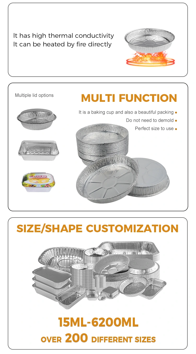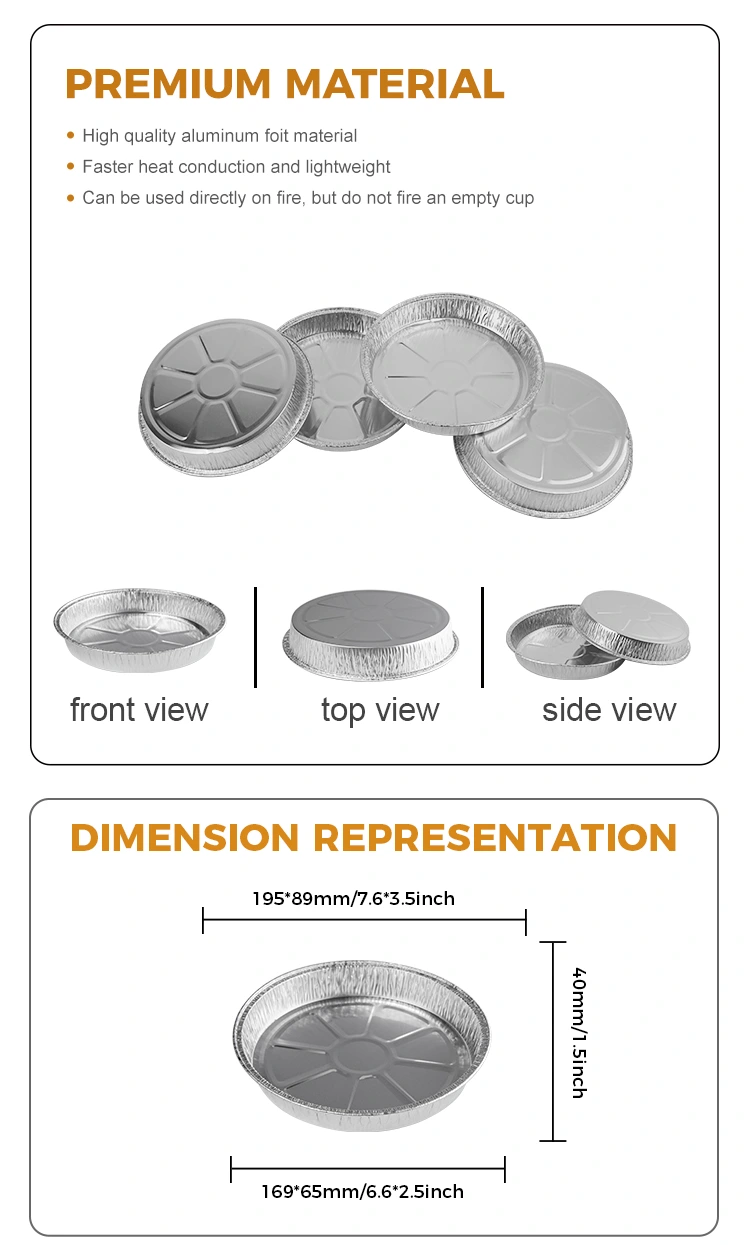 Die Yunchu -Aluminiumfolie bietet 7 Zoll gefaltete Pizza -Pizza -Silber -Aluminiumfolienbehälter mit Modellnummer 5067. Das Produkt hat einen oberen Durchmesser von 168 mm (ca. 6,6 Zoll), einen niedrigeren Durchmesser von 145 mm (ca. 5,7 Zoll) und eine Höhe von 25 mm (area. Mit einer Kapazität von ca. 400 ml (ca. 14,1 oz) ist es ideal zum Backen von Pizza, ohne beim Backen zu kleben, Schimmel einfach zu entlassen und ohne Geruch. Darüber hinaus verhindert sein voll geklemtetes Design, dass Lebensmittel ausschütten und die Praktikabilität zunimmt. Wir können auch Logo -Anpassungsdienste anbieten, um den Eindruck Ihrer Kunden zu vertiefen und die Sichtbarkeit Ihrer Marke zu verbessern.