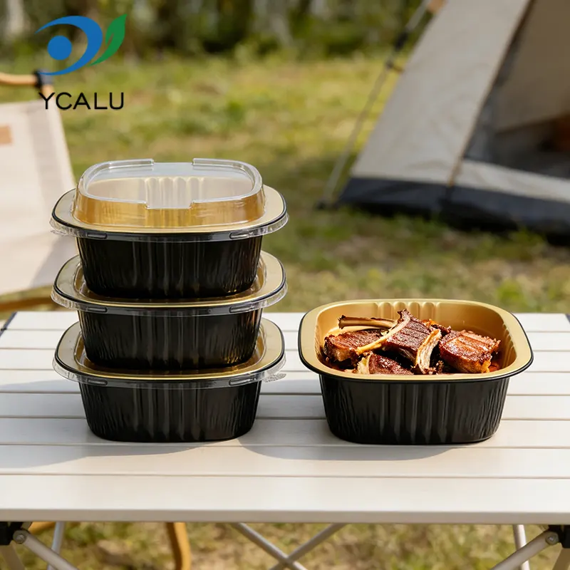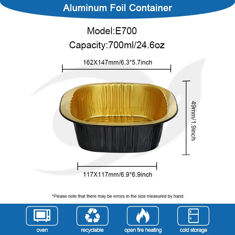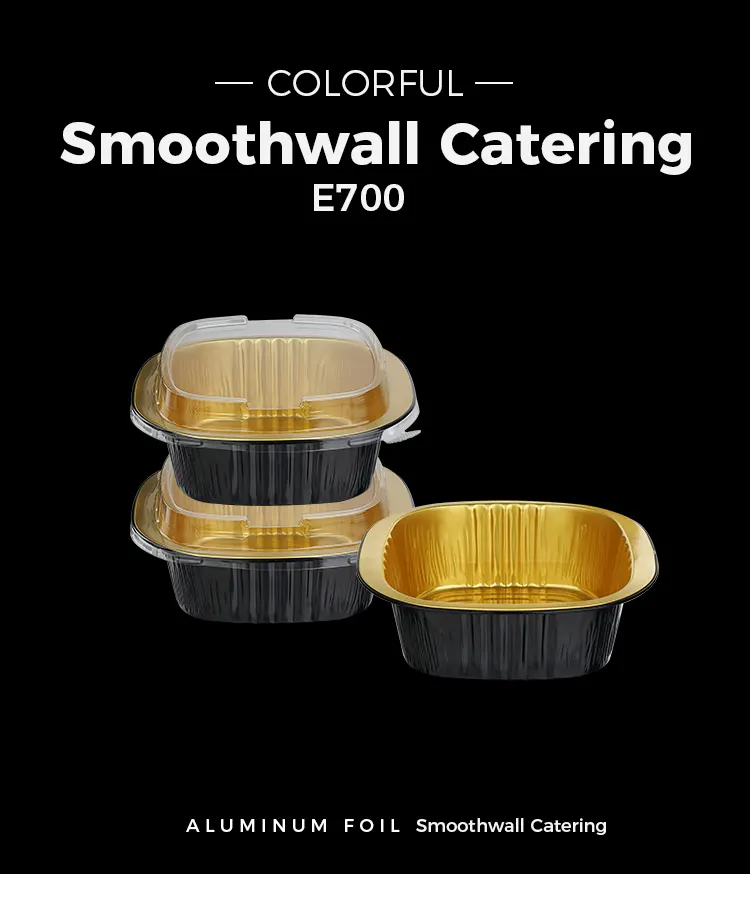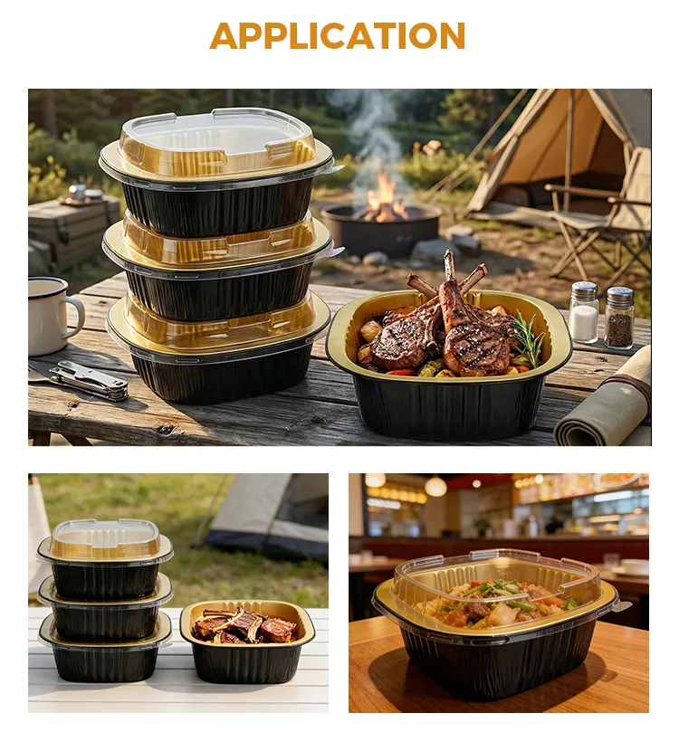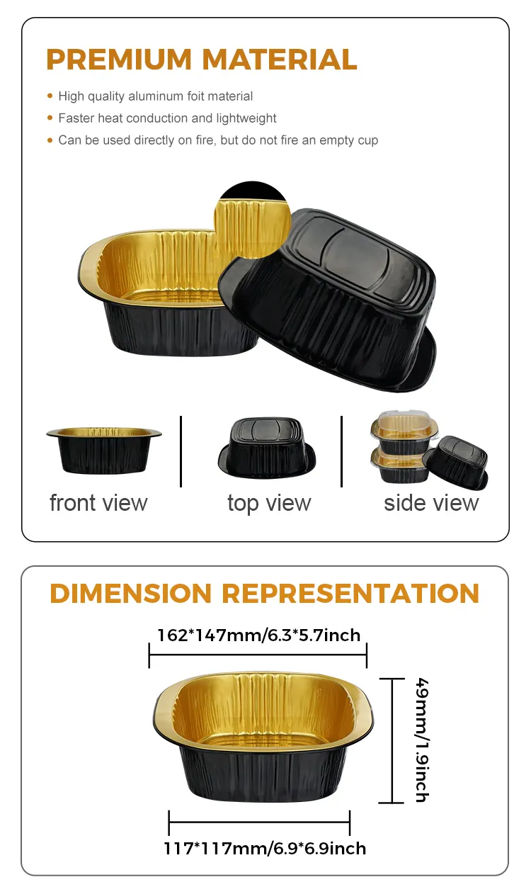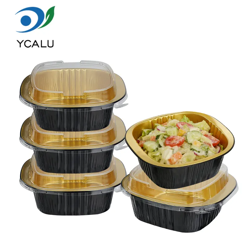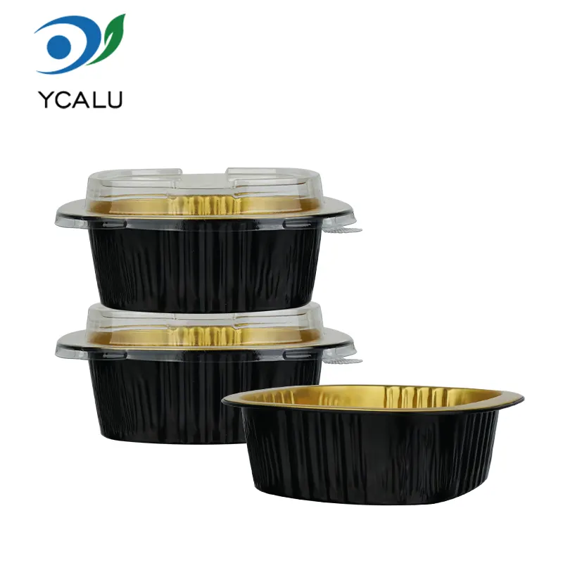 Die binauralen, quadratischen, schwarz-goldenen, leichtwandigen Einweg-Aluminiumfolienbehälter des Yunchu Aluminiumfolienlieferanten bestehen aus lebensmittelechter 8011-Aluminiumlegierungsfolie. Sie wurden mit Hochtemperatur-Glüh- und Sterilisationsprozessen behandelt, um eine dichte Oxidschicht auf der Oberfläche zu bilden. Sie enthalten keine Schwermetalle und keinen Geruch. Sie können in direktem Kontakt mit allen Arten von Lebensmitteln stehen und verhindern die Ausfällung von Schadstoffen bei hohen Temperaturen. Ganz gleich, ob sie zum Aufbewahren von warmen Gerichten, kalten Gerichten, Desserts oder Soßen verwendet werden, sie können die Lebensmittelsicherheit gewährleisten und mehreren Sicherheitszertifizierungen wie FDA und SGS entsprechen, sodass jeder Bissen sicherer ist. Das einzigartige schwarz-goldene Lichtwanddesign durchbricht die eintönige Textur traditioneller Aluminiumfolienbehälter. Die mattschwarze Goldbeschichtung und die glatte Wandoberfläche vermitteln ein High-End-Gefühl. Es hat nicht nur ein hervorragendes Aussehen, es kann auch Licht und Sauerstoff wirksam blockieren, die Oxidation von Lebensmitteln verzögern, das Aroma und die Feuchtigkeit von Lebensmitteln fest einschließen, Geruchsübertragung verhindern und den ursprünglichen Geschmack von Lebensmitteln für lange Zeit bewahren. Die glatte Wandoberfläche weist keine Rillen oder Falten auf, wodurch sich weniger Bakterien ansammeln und sie leicht zu reinigen ist. Es kann sich auch besser an die individuelle Druckanpassung anpassen und so Catering-Marken dabei unterstützen, ihren Bekanntheitsgrad und ihre Qualität zu steigern.