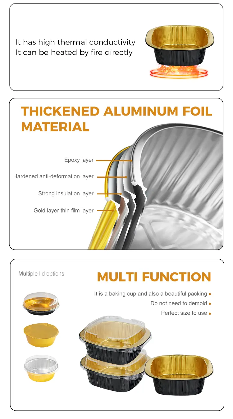 Hot-Tags: Einweg-Behälter aus binauraler quadratischer Aluminiumfolie in Schwarzgold