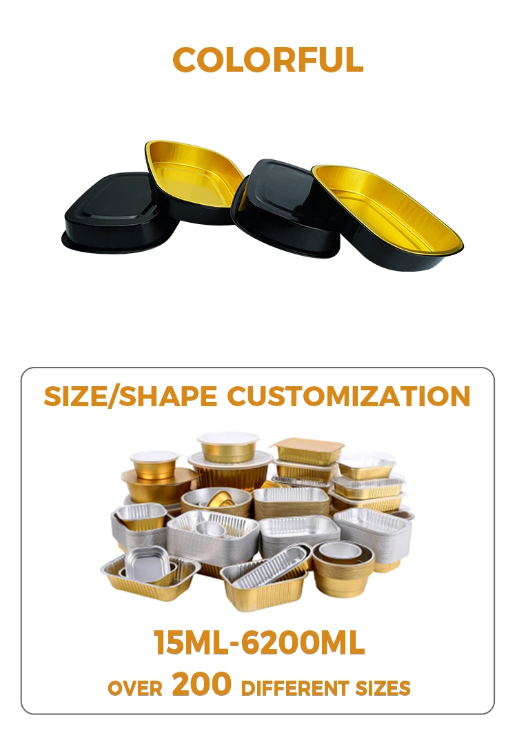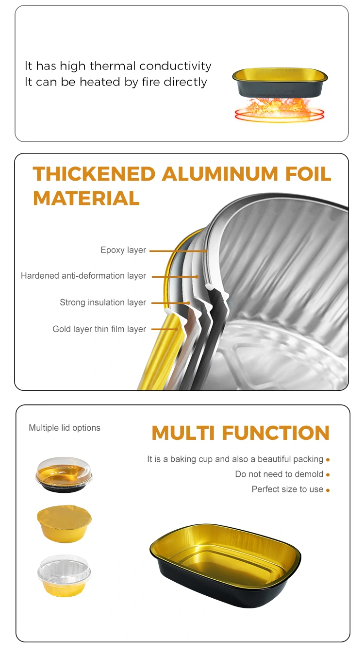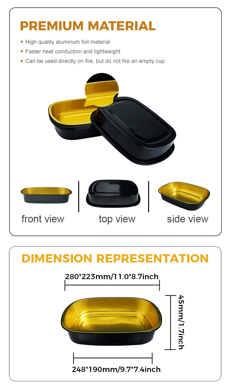Yunchu Aluminiumfolienlieferant Einweg-Black Gold Catering Rechteckige Aluminiumfolienbehälter eignen sich für große Volks Catering- und Takeaway-Industrien, insbesondere für Backen, Catering-Ketten und Selbstbedienungsketten und andere Szenarien, das Produkt besteht aus 8011-Nahrungsmittel-Nahrungsmitteln. Zutaten zu platzieren, können mit Aluminiumfolie -Versiegelungsdeckel und PET -PET -TEIL -Transparent Deckel verwendet werden, wobei eine ausgezeichnete Versiegelungsleistung, Hochtemperaturwiderstand sowie Öl- und Leckpräventionsfunktionen verwendet werden. Es wird in verschiedenen Szenarien wie Lebensmittelverpackungen, Heizung, Kühlung und Lieferung zum Mitnehmen verwendet. Die Oberfläche nimmt ein leichter Wanddesign mit flachem und glattem Erscheinungsbild an, das für die automatische Versiegelung des hitzebockten Films geeignet ist, wodurch die Effizienz der Verpackung verbessert wird.