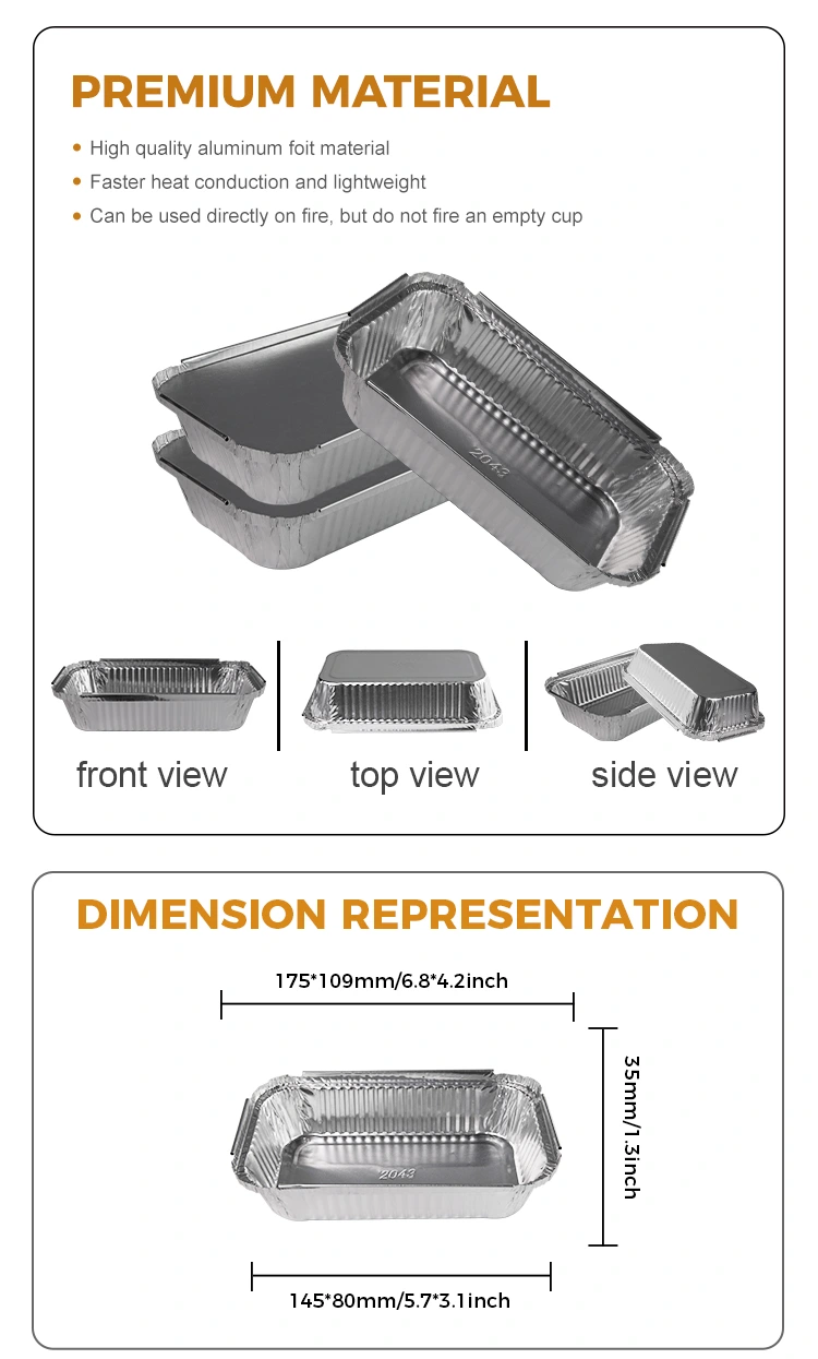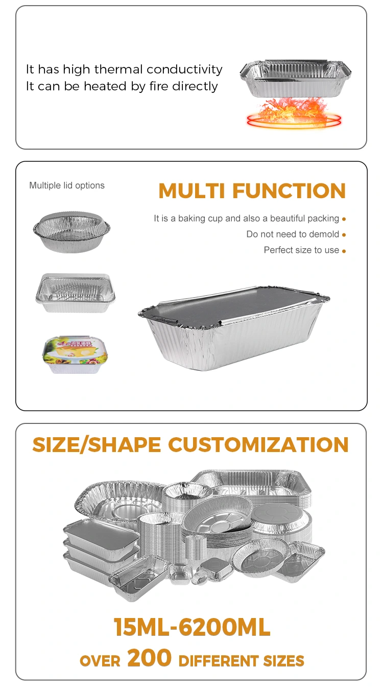 Diese Einweg-Fast-Food-Box-Barbecue-Aluminiumfolienbehälter besteht aus hochwertigem 8011-Aluminiumfolienmaterial, das einen guten Wärmeerhaltungseffekt hat und die Temperatur des Essens aufrechterhalten kann, wodurch das Essen köstlicher und köstlicher wird. Darüber hinaus ist unser rechteckiger BBQ -Silber -Aluminiumfolienbehälter mit einer thermischen Isolationsfunktion ausgestattet, die mit Aluminiumfolie -Deckel oder Plastikdeckel für Haustiere kombiniert werden kann, was für maßgeschneidertes Logo geeignet ist und das Markenbild weiter verbessert.