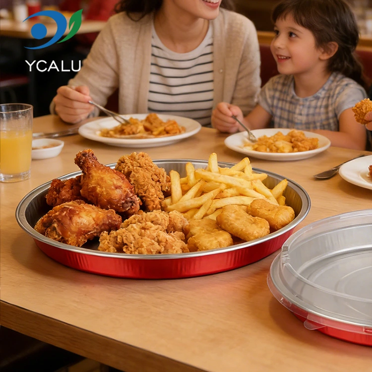 Yunchu Aluminiumfolienlieferant C900 Einweg-Pizzapfannenverpackung runder Aluminiumfolienbehälter hat eine glatte und schöne Oberfläche und eine hervorragende Textur. Das Design nimmt eine runde Form mit Außenkanten an, was nicht nur die Gesamtästhetik verbessert, sondern es dem Benutzer auch ermöglicht, es auf glatten Oberflächen leicht zu greifen, um ein Verrutschen zu vermeiden, wobei sowohl Praktikabilität als auch Komfort berücksichtigt werden. Sein vernünftiges strukturelles Design eignet sich für die Verwendung in Lebensmitteln in verschiedenen Szenarien. Es kann häufig bei der Pizzazubereitung, beim Verladen von Obst, bei kleinen Verpackungen am Fließband usw. verwendet werden. Es verfügt über eine starke Anpassungsfähigkeit. Ob Bäckerei, Restaurant, Buffet oder andere Catering-Szenen, die Kombination kann die Qualität hervorheben und zu einer idealen Wahl für Verbraucher werden. Gleichzeitig kann der Behälter an vollständig transparente PET-Materialien, versiegelte Deckel aus beschichteter Aluminiumfolie usw. angepasst werden, was nicht nur die Sicherheit während des Transports wirksam gewährleisten und das Auslaufen und Beschädigen von Lebensmitteln verhindern, sondern auch das ursprüngliche Erscheinungsbild des Produkts deutlich zur Geltung bringen und die Produktwirksamkeit verbessern kann.
