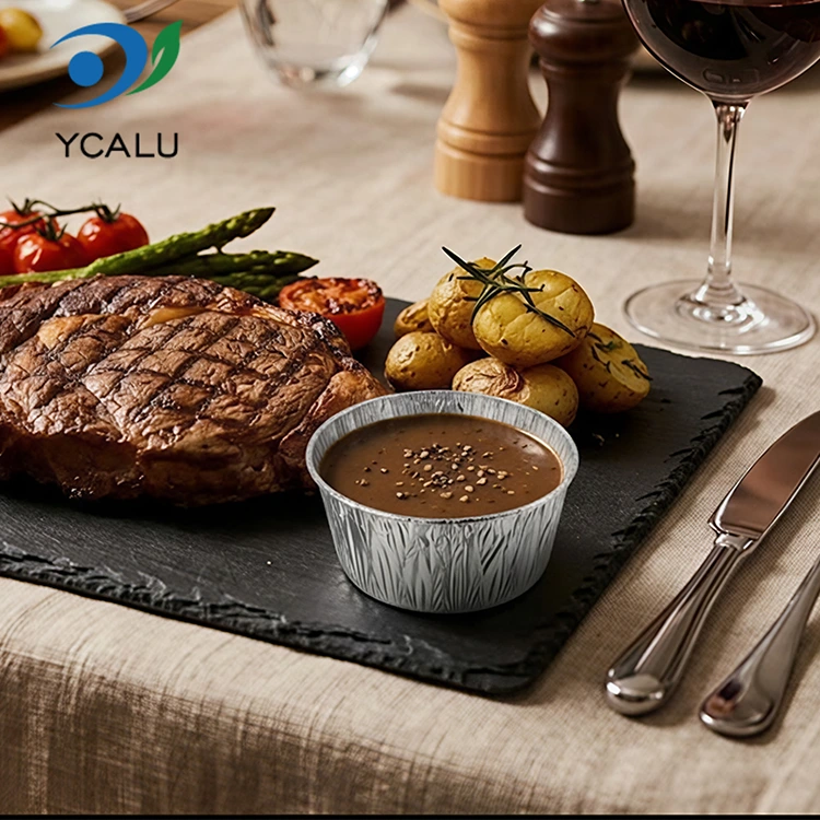 • Runde Einweg-Lebensmittelbehälter aus silberner Aluminiumfolie für SaucenRunde Einweg-Lebensmittelbehälter aus silberner Aluminiumfolie für Saucen