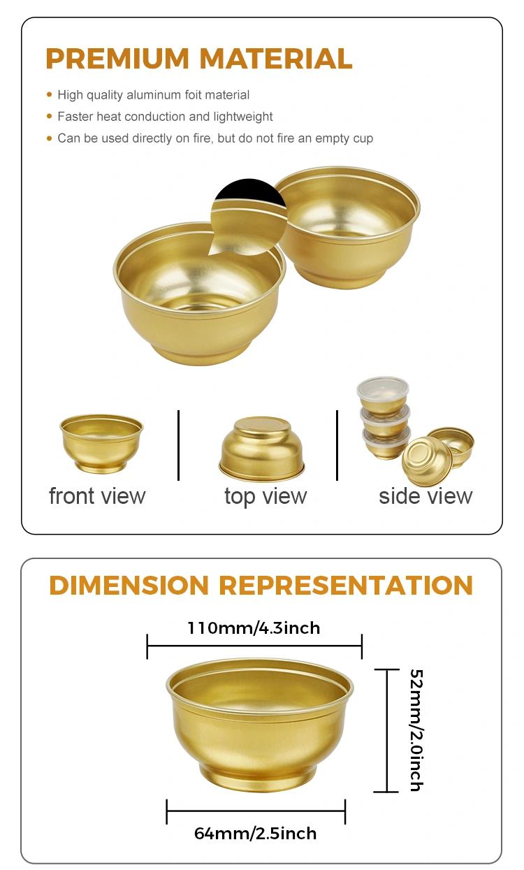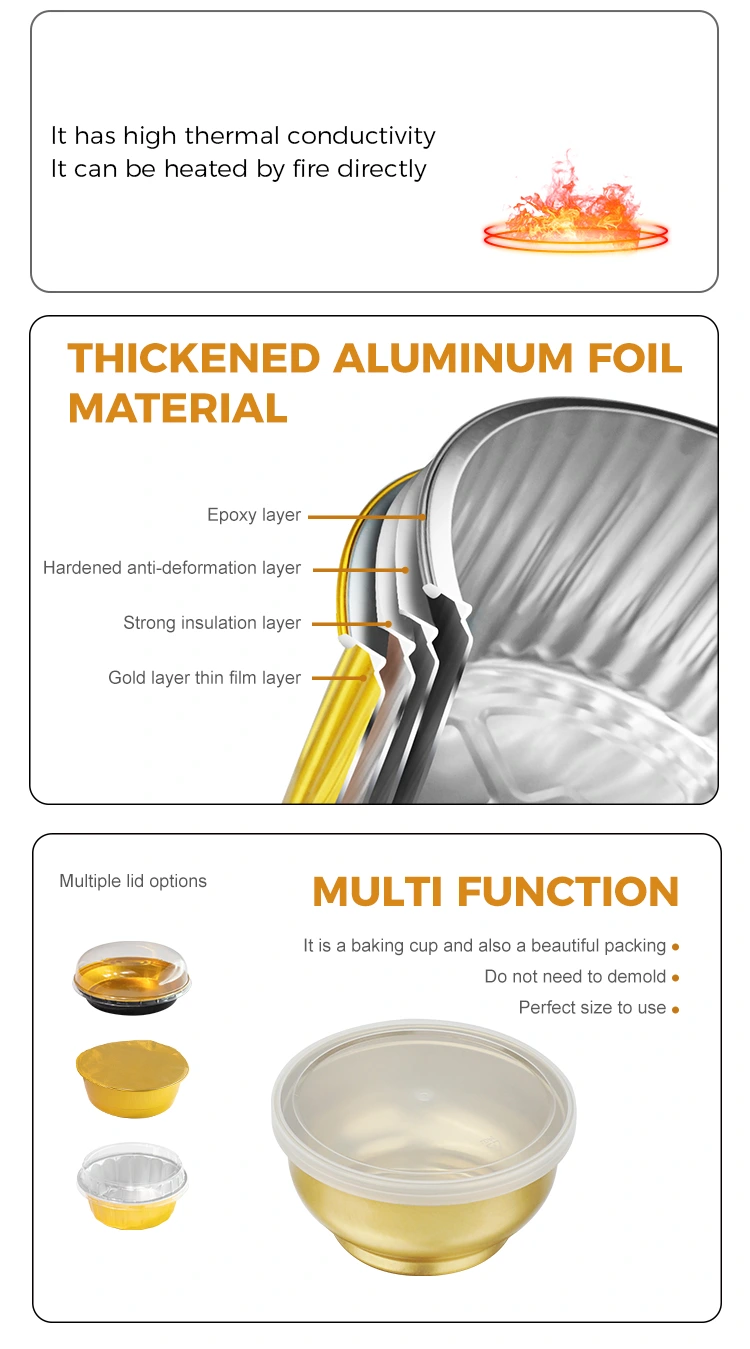 Yunchu-Aluminiumfolienlieferant, Einweg-Aluminiumfolienbehälter mit runder kleiner Goldschale, verdickte Aluminiumfolie, hohe Härte, nicht leicht verformbar, kann ohne Auslaufen versiegelt werden, starke Hitzebeständigkeit, wiederverwendbar, dient sowohl als Form als auch als Verpackung, Hochtemperatur-Sterilisation. Aluminiumfolienverpackungen sind sicher, hygienisch und haben gute Wärmeisolationseigenschaften – starke Hitzebeständigkeit – kann sein gedämpft, gekühlt, gefroren und ist recycelbar. PE-Innenmembran in Lebensmittelqualität, Metallmaterial gepaart mit PE-Innenmembran in Lebensmittelqualität, farbloser und geruchloser dicker Behälterkörper sorgt dafür, dass sich der kleine Behälter nicht leicht verformt, bietet guten Schutz, starke Versiegelungssicherheit und Zuverlässigkeit, der Flaschenverschluss verbindet sich eng mit dem Flaschenkörper, starke Versiegelung hält die Frische des Produkts länger aufrecht, völlig neue Materialien, die sicher, umweltfreundlich und geruchlos sind. Einweg-Aluminiumfolienbehälter mit runder kleiner goldener Schüssel werden häufig in verschiedenen Lebensmittelindustrien verwendet, z. B. in Lebensmittelfabriken, Süßwarenfabriken, Trockenobstfabriken, Bäckereien, Lebensmittelfachgeschäften und Trockenobstsortiergeschäften usw. Sie werden zur Aufbewahrung von Lebensmitteln, Süßigkeiten, Honig, Trockenpflaumen, Trockenfrüchten, gealterten Mandarinenschalen, festen, flüssigen und festen Essenzen verwendet.