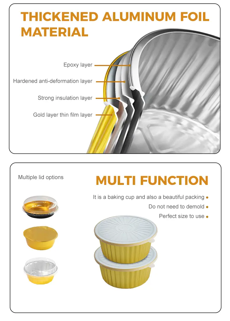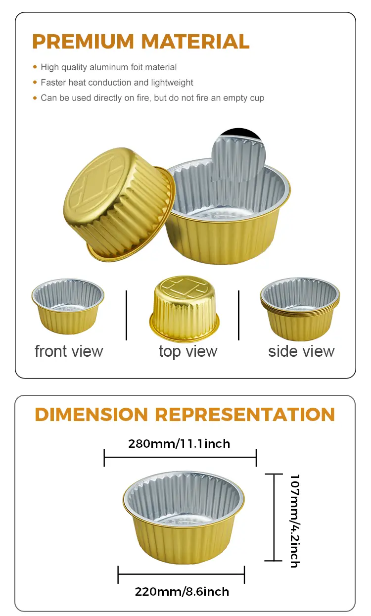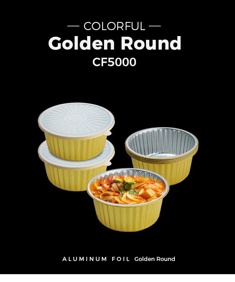 Yunchu Aluminiumfolie Einweg dicht goldene runde Aluminiumfolie-Behälter Modell CF5000 Versorgung Großhandel hat eine breite Palette von Verwendungsmöglichkeiten, kann den überdachten Aluminiumfolie-Heizung Dichtungsdeckel zum Backen, Lagerung, Transport und Versorgung aller Arten von Montagelinien usw. verwenden. Geschäfte, Urlaubsfeiern, Catering-Aktivitäten, Self-Service-Catering-Geschäfte usw., Einweg-dichtes, goldene runde Aluminiumfolienbehälter aus hochwertigem 8011-0 Aluminiumfolie, Einwegbackschale mit Deckel ist langlebig, nicht leicht durchbohrt oder beschädigt. Das Material ermöglicht eine gleichmäßige Verteilung der Wärme, eine gute Wärmeerhalte, keine Klebrigkeit, keine brennende, wasserdichte und ölfeste, keine Notwendigkeit zu reinigen, keine Belastung für Ölflecken. Die glatten Kanten verletzen Ihre Hände nicht und stellen sicher, dass die vorbereiteten Gerichte vollständig gekocht sind. Die Folienpfanne ist in einer eleganten goldenen Farbe fertiggestellt, die die Präsentation verbessert und Ihre Küche oder Ihr Event -Dekor ergänzt.