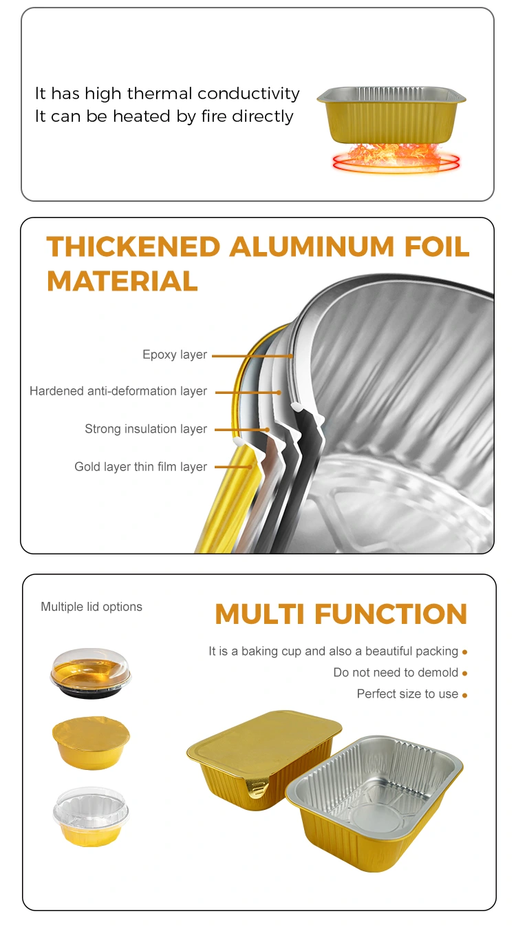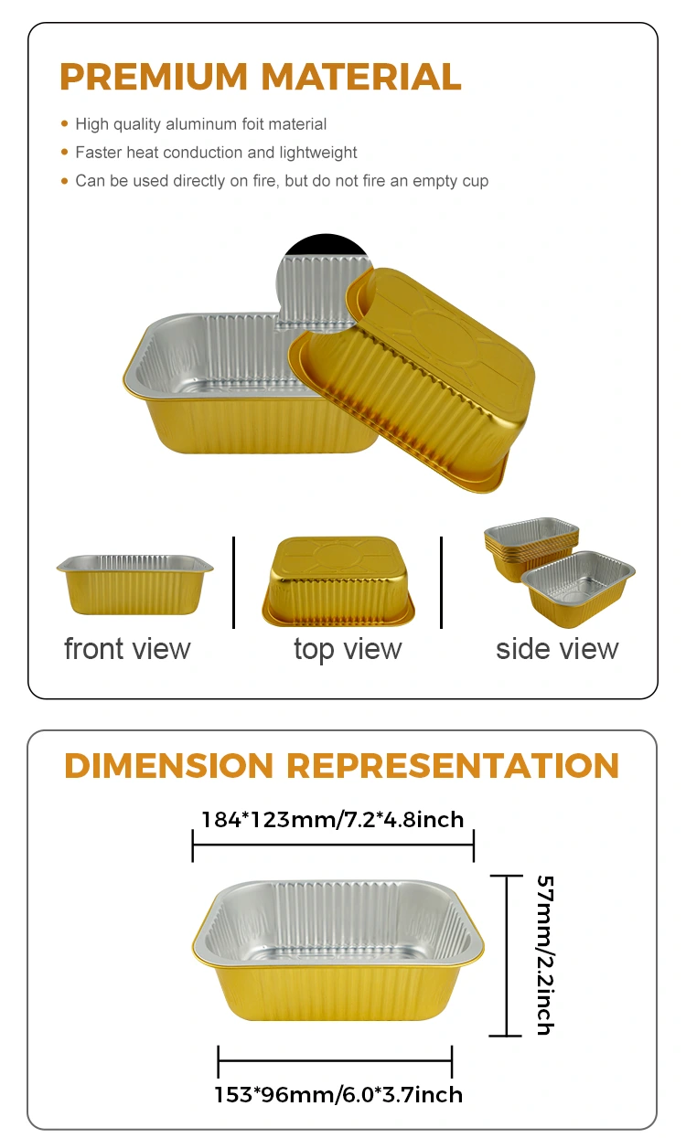 Yunchu Aluminiumfolienlieferant Einweg-Einweg-Quadrat-Dichtung Gratin Aluminiumfolienbehälter besteht sorgfältig aus hochwertigem Aluminiumfolienmaterial mit hochwertigem Lebensmittelqualität, das mit Aluminiumfolienversiegelungsdeckel verwendet werden kann, der eine ausgezeichnete Versiegelungsleistung, eine hohe Temperaturfestigkeit sowie die Öl- und Leckfestigkeit aufweist. Es wird in verschiedenen Szenarien wie Lebensmittelverpackungen, Heizung, Kühlung und Lieferung zum Mitnehmen verwendet. Die Oberfläche ist mit einer leichten Wand ausgestattet, und das Aussehen ist flach und glatt, was für die automatische Versiegelung des Heizdichtungsfilms bequem ist, um die Verpackungseffizienz zu verbessern.