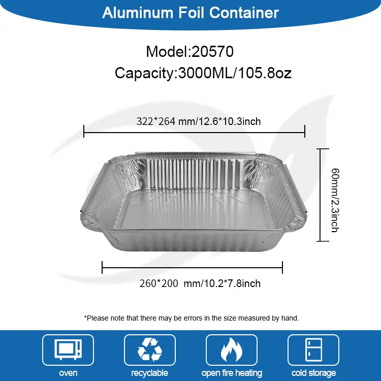 Yunchu Aluminiumfolienlieferant große Kapazitätsgrill-Teller Silber Aluminiumfolienbehälter kann direkt in einen großen Ofen, einen Dampfer oder Gefrierschrank usw. eingebaut werden. Das Gewicht des Produkts kann das Gewicht verschiedener Gegenstände tragen, die Form und die Struktur des Produkts können leicht gestapelt werden, um die Transportfläche zu retten. Das Produkt ist leicht zu markieren, und das sanfte Flächen-Tech-Schachkörper. Das reibungslose Oberflächen. Das Produkt ist ein verfügbares Produkt, das nicht reinigt und Arbeitskosten einsparen muss. Es kann mit voll transparenten Aluminiumfolie-Abdeckung von PET, effektivem staubdestfestem und leckfestem, verstorbener und regelmäßiger konkav und konvexer Form am Boden abgestimmt werden, so dass die Haltbarkeit und die Sicherheitsleistung gut und maßgeschneidert sind, tragbar kann zu jedem Zeitpunkt erhitzt werden, und andere Szenenkonstruktionen, Hochtemperatur und niedriger Temperatur Widerstand, Temperatur-Temperaturen-Temperaturen-Temperaturen-Temperaturen-Temperaturen, mit 250 ° C. Erhaltung und Transportdichtheit des Produkts. In Übereinstimmung mit iOS9001 können SGS Food -Kontaktstandards usw. in die Welt exportiert werden.