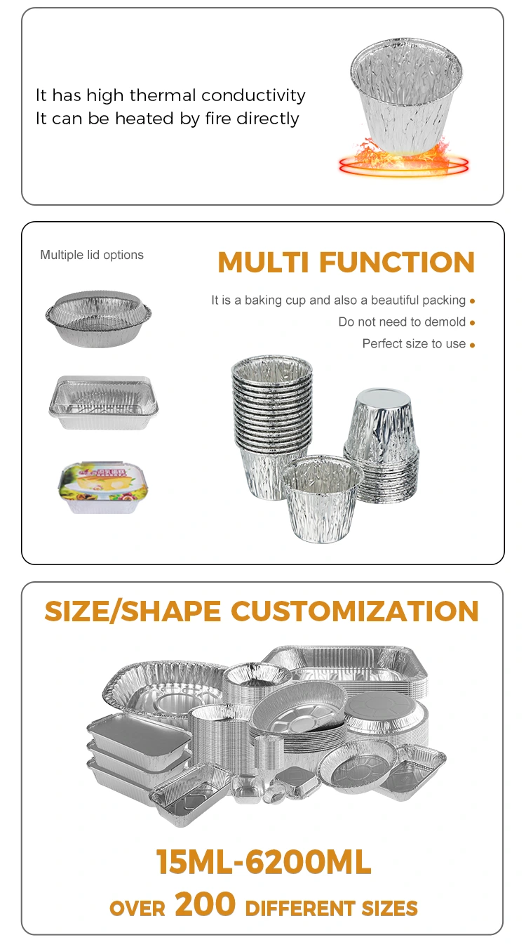 Yunchu-Aluminiumfolienlieferant, Einweg-Backkuchen, silberner Aluminiumfolienbehälter, Aluminiumfolienmaterial in Lebensmittelqualität, verdicktes Material ist auslaufsicher und komprimierbar, um die Stabilität der Massenproduktion zu gewährleisten. Die Wärmeleitung ist gleichmäßig und schnell, was die Backzeit verkürzt und die Effizienz der Essenslieferung verbessert.