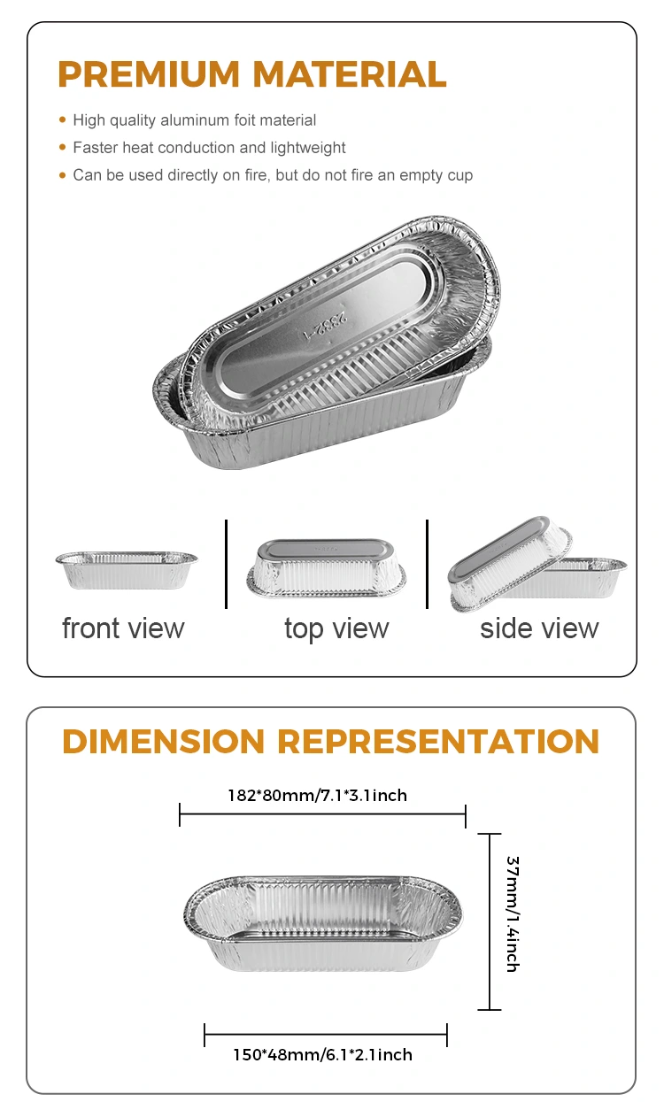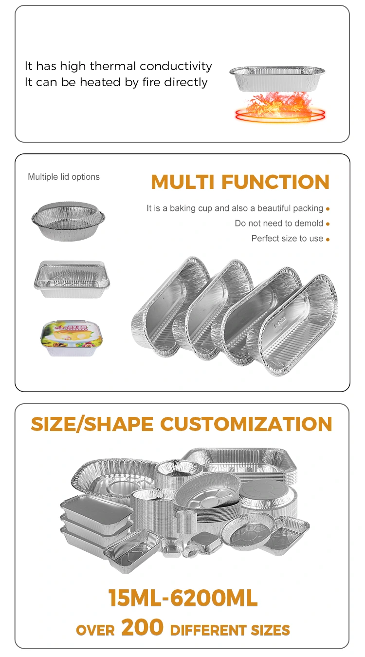 Yunchu Aluminiumfolienlieferant Ovales Luftbraten Back Silber Aluminiumfolie -Behälter ist eine Art Behälter, die zum Dämpfen, Kochen, Backen, Backen und anderen Zwecken verwendet werden kann und für Saucen, Eintauchsaucen, kleine Gewiss und Backproben verwendet werden kann. 8011-0 Aluminiumfolienmaterial, Zugfestigkeit und Korrosionswiderstand haben eine gute Dehnung, ein verdicktes Aluminiumfolienmaterial, langlebig und nicht leicht zu brechen, bei Willen, Säumen, vordere und hintere Halbkreisdesign verletzt die Hände nicht, integrierte Form, Wandoberfläche ist so glatt wie ein Spiegel, eine reichhaltige Größe, die für die Verwendung von Szenarien eine reichhaltige Größe geeignet ist.