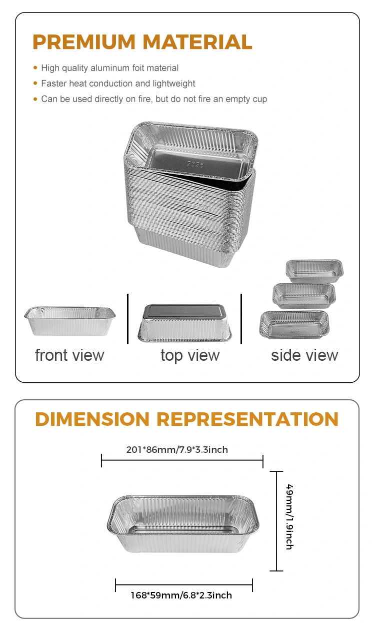 Yunchu Aluminiumfolien Lieferanten Modell 2325 Rechteckige Luftbraten zum Mitnehmen von Aluminiumfolie-Behältern mit hoher Qualität von Aluminiumfolie wird verdickt und nicht leicht zu brechen. Sie kann über eine offene Flamme erhitzt werden. Dieser Aluminiumfolienbehälter ist nicht nur schön, sondern auch sehr praktisch. Es kann dem Backen mit hohem Temperaturen standhalten, nicht leicht zu verbrennen oder den Boden zu verformen, und das Design des Bodens ist auch schön und elegant, was effektiv verhindern kann, dass Lebensmittel kleben. Darüber hinaus macht das hochseitige Design die Kombination aus Aluminiumfolien stabiler und einfacher zu bedienen. Unabhängig davon, in welcher Größenspezifikation Sie sich entscheiden, passt sich dieser Aluminiumfolienbehälter perfekt an verschiedene Topfgrößen an und richtet sich an Ihre vielfältigen Bedürfnisse. Damit mehr Verbraucher qualitativ hochwertige Produkte und Dienstleistungen genießen können, bieten wir eine Vielzahl von Größenspezifikationen zur Auswahl und können das Musterdruck entsprechend Ihren Bedürfnissen an die Erfüllung der personalisierten Bedürfnisse anpassen. Mit einem einzigen MOQ von nur 1000 Teilen ist der Kaufprozess einfach und schnell und die Kostenleistung ist extrem hoch. Wenn Sie Fragen haben oder ein weiteres Verständnis für unsere Produkte benötigen, können wir Ihnen gerne an uns kontaktieren.