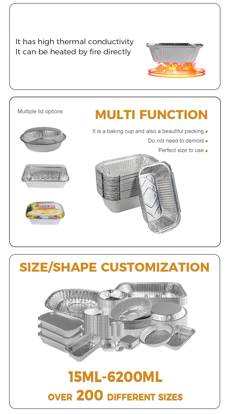 Merkmale: Die von uns angebotene Aluminiumfolien -Lunchbox besteht aus 8011 Aluminiumfolienmaterial, das eine hervorragende Leistung der Hitze aufweist und die Temperatur der Lebensmittel effektiv aufrechterhalten kann, wodurch Ihr Lebensmittel attraktiver wird. Insbesondere unsere Aluminiumfolienbehälter mit rechteckig gebackenem Reissilber sind nicht nur thermische Isolationseigenschaften, sondern können auch mit Aluminiumfolie -Deckeln oder Plastikleitern aus Aluminium -Folien kombiniert werden, um die personalisierte Anpassung der Logos zu erleichtern, wodurch die Kundendemperaturpunkte verbessert und das Markenbewusstsein verbessert werden.