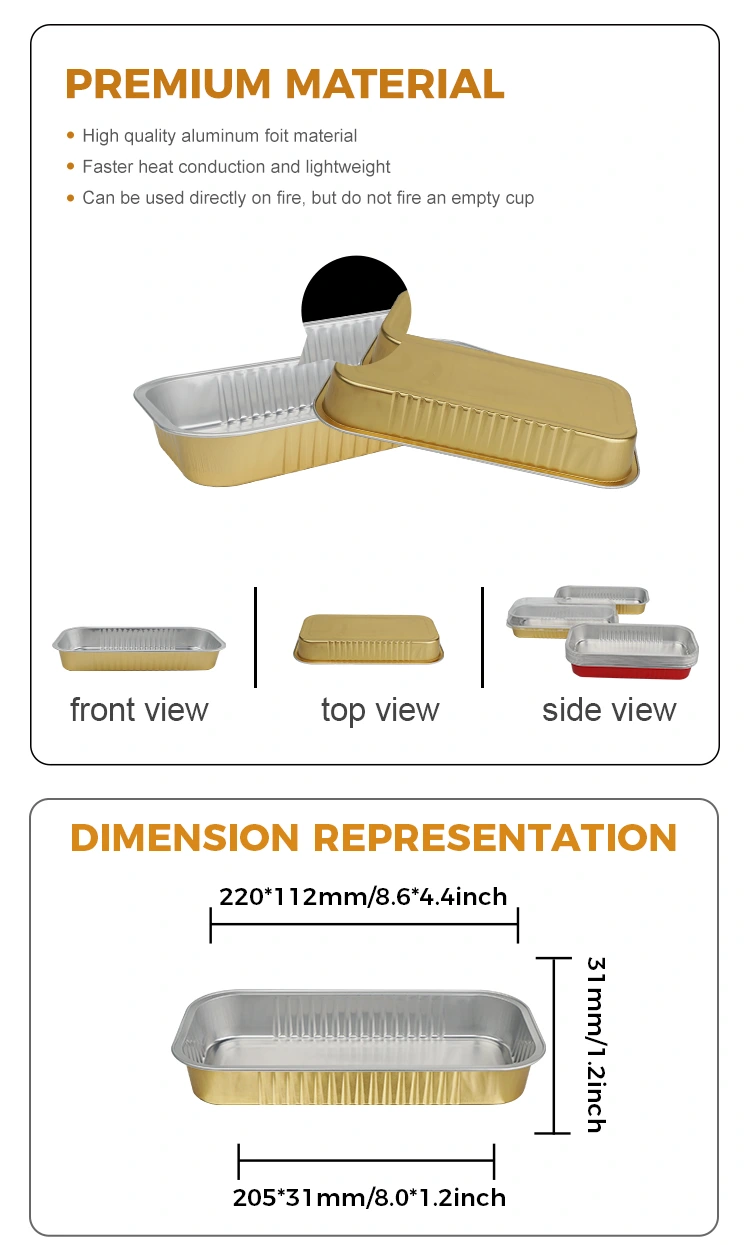 Vom Backen und der Produktion bis hin zur Präsentation, Lagerung und Mitnahme bieten die rechteckigen, goldfarbenen Smoothwall-Aluminiumfolienbehälter den doppelten Vorteil „Aussehen + Stärke“, sodass jede köstliche Mahlzeit den Verbraucher raffinierter und sicherer erreicht. Entscheiden Sie sich dafür, damit Backen nicht nur zum Geschmacksgenuss, sondern auch zu einer umfassenden Steigerung von Vision und Erlebnis wird!
