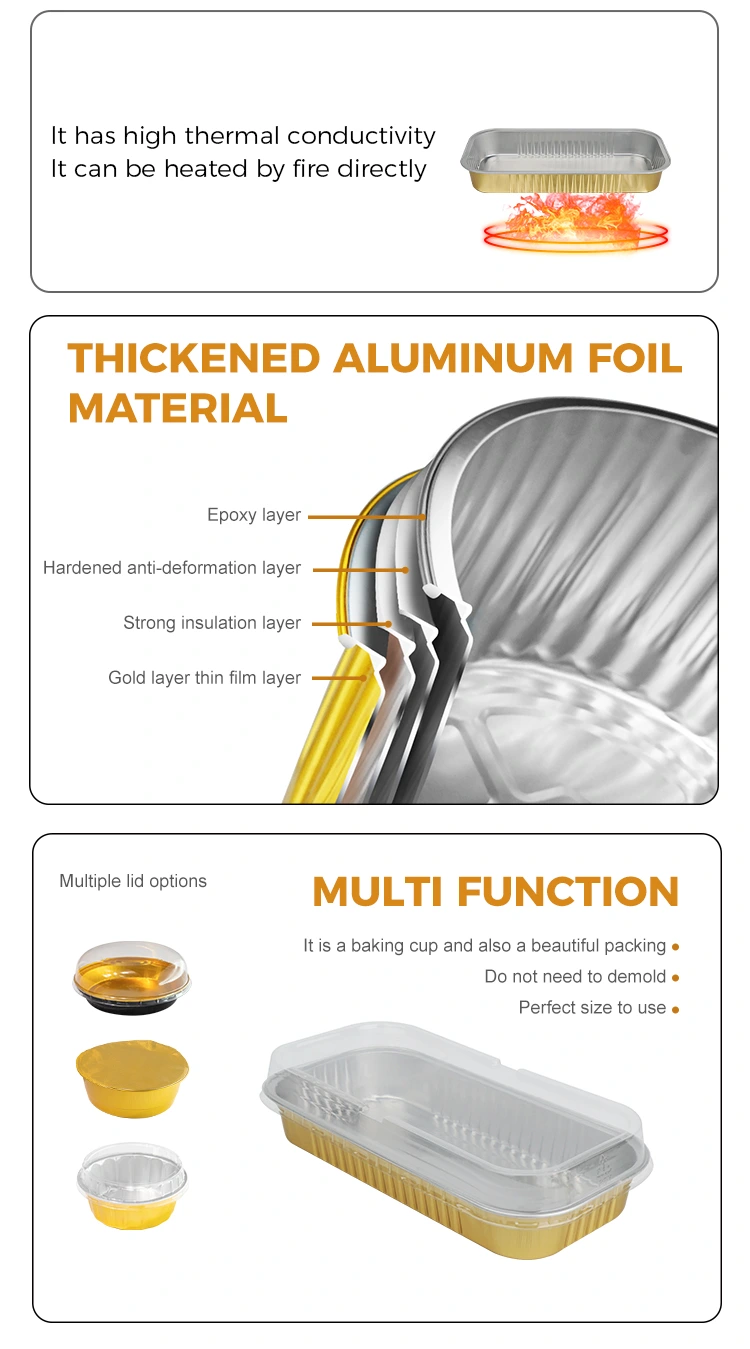 Die hervorragende Wärmeleitfähigkeit des Aluminiumfolienmaterials ermöglicht eine schnelle und gleichmäßige Übertragung der Ofenwärme auf das Innere der Lebensmittel, wodurch lokale Anbrenn- oder Sandwichprobleme vermieden werden. Beim Backen von langem Gebäck schmiegt sich der Kastenkörper eng an die Form des Lebensmittels an und schließt Feuchtigkeit und Aroma ein. Beim Backen ist die Außenseite außen knusprig und die Innenseite weich. Der Geschmack ist weitaus besser als bei gewöhnlichen Glas- oder Plastikbehältern. Die Kanten der Box sind abgerundet, was kratzfest ist und ein Auslaufen der Suppe wirksam verhindert. Die rechteckigen goldenen Back-Smoothwall-Behälter aus Aluminiumfolie eignen sich für gebackene Köstlichkeiten mit Soßen (z. B. Lava-Schokoriegel, Karamell-Nuss-Brötchen).