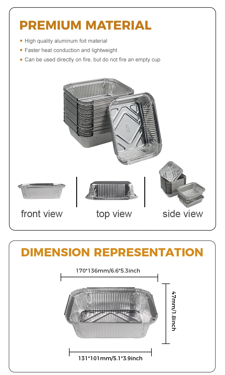 Das in China hergestellte Modell 2056 Rechteckig Gratin ist verpackte Silber -Aluminiumfolienbehälter mit einem Oberflächen von 170*136 mm (6,9*5,3 Zoll), einem Basisdurchmesser von 131*101 mm (5,1*3,9 Zoll), einer Höhe von nur 47 mm (1,8). Diese Größe ist nicht nur leicht zu tragen, sondern erfüllt auch eine Vielzahl unterschiedlicher Verwendungsbedürfnisse.
