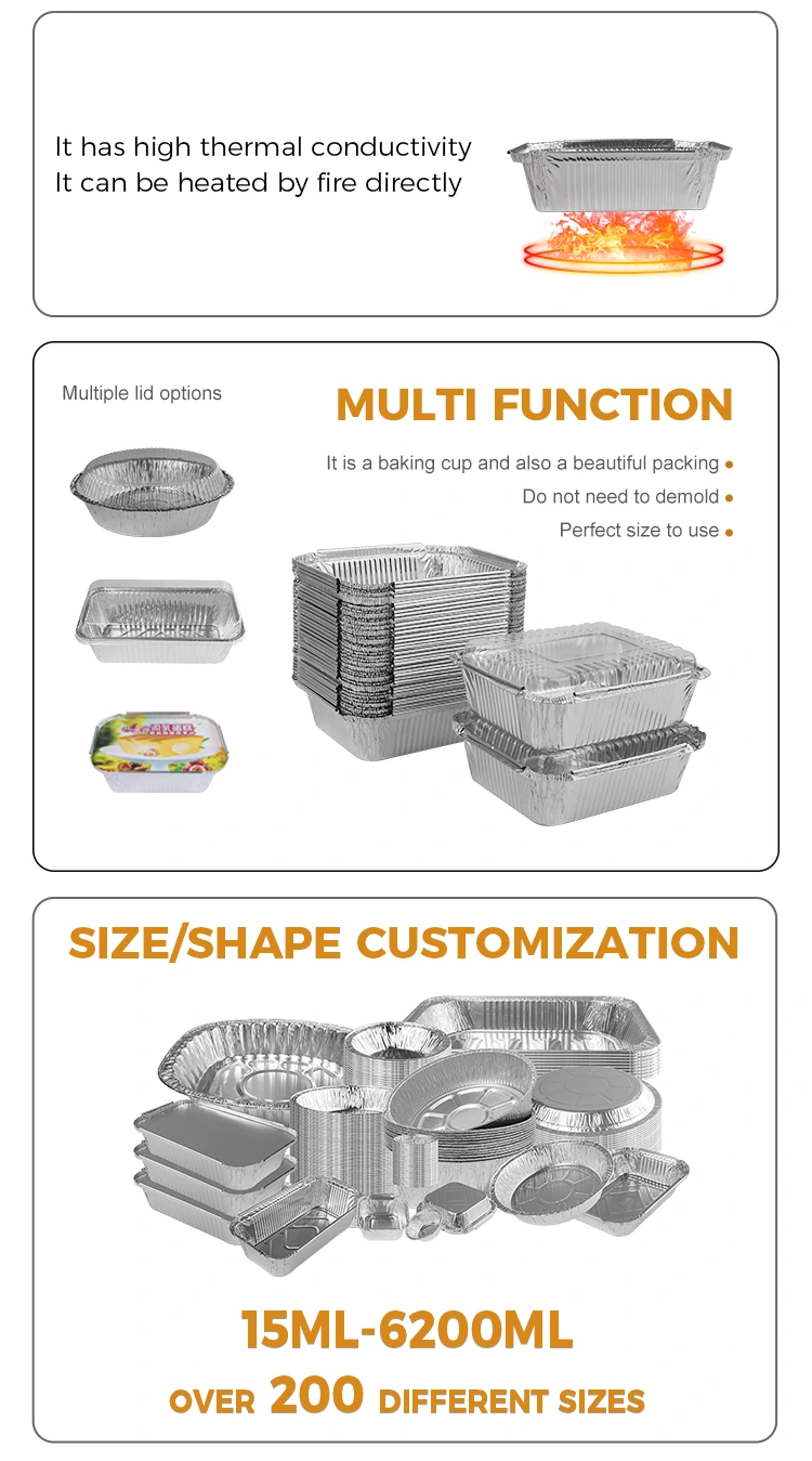 Das rechteckige Gratin ist verpackte Silber-Aluminium-Folienbehälter, die von Yunchu Aluminiumfolie geliefert werden, aus Silbermaterial von hochwertigem 8011-0-Lebensmittel. Dieser Behälter eignet sich für eine Vielzahl von Kochmethoden wie Luftfritteusen, Grillabende, Backen und vorgefertigten Gerichten und kann schnell Lebensmittel für das tägliche Leben erwärmen. Es ist sehr flexibel, das Material ist stark und langlebig und es ist nicht einfach zu verformen oder zu brechen. Dank seines verdickten Designs kann dieser Aluminiumfolienbehälter offene Flammenheizung standhalten, um die Sicherheit der Verbraucher zu gewährleisten und eine gute Temperatur- und Feuchtigkeitsbeständigkeit aufweist, wodurch es für einen sicheren Transport geeignet ist.