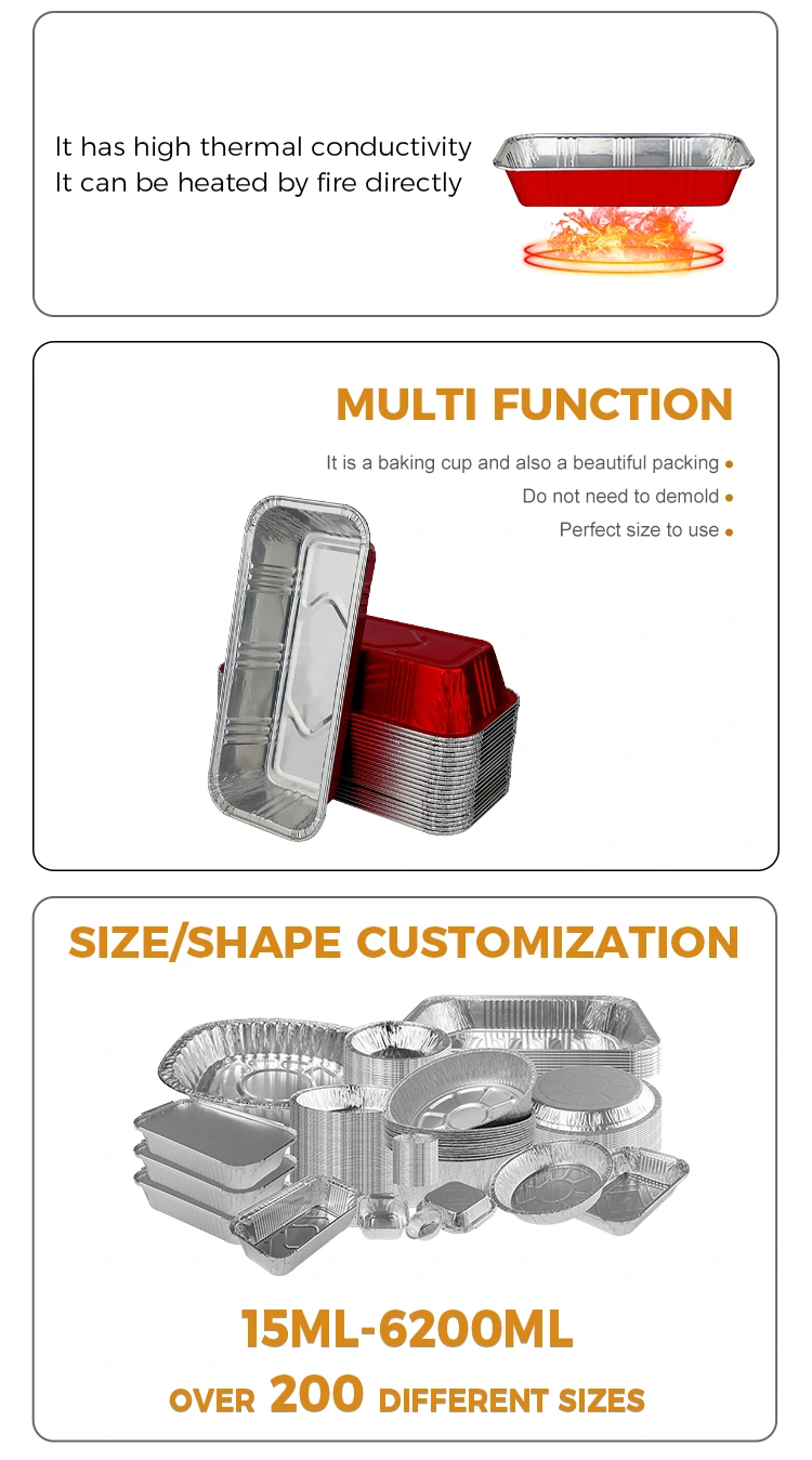 Yunchu-Aluminiumfolie bietet Ihnen hochwertige rechteckige rote Back- und Catering-Behälter aus silberner Aluminiumfolie, die langlebig und hitzebeständig sind, die Wärme gleichmäßig leiten können, um ein Verkohlen zu verhindern, und über eine starke Versiegelung verfügen, um frisch zu bleiben.