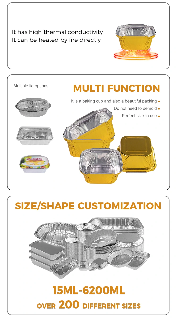 Yunchu Aluminiumfolie quadratische Backofen-Silber-Aluminiumfolie-Behälter Beschützer ist ohne Wasch- und Mehrbrand, wasserdicht und öldrasieren, keine Notwendigkeit, Ofen, Luftbraten, Barbecue, dampfendes spezielles, verdicktes Material wiederholt ohne Verformungen zu reinigen. Gefriergetrocknete, gedämpfte Eier, Pudding-Backen, Obstsalat usw., sicher, dass die Materialien für Lebensmittelkontakt-Kontakt-Grade-Materials streng den Anforderungen befolgen, um die materiellen Materialien des Lebensmittelqualitäten zu wählen, dh Formen sind auch Verpackungen, die Aluminiumfolien-Abdeckungskombinationskombination, die den Großhandel der Bestelldienste annimmt, akzeptiert auch Aufträge mit einem einzigen MOQ von 3000 Stück.
